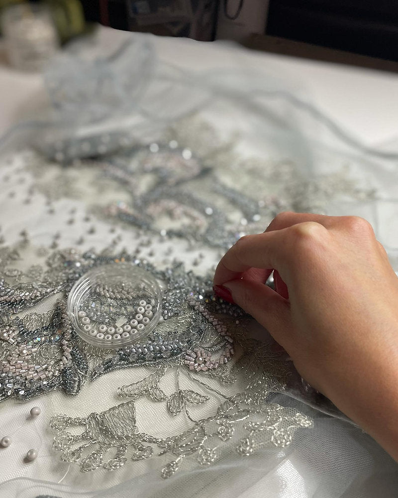 Each gown is constructed with the utmost precision. Attention to detail is unparalleled, with every sequin, bead, embellishment, and embroidery delicately placed and sewn with exceptional precision.
